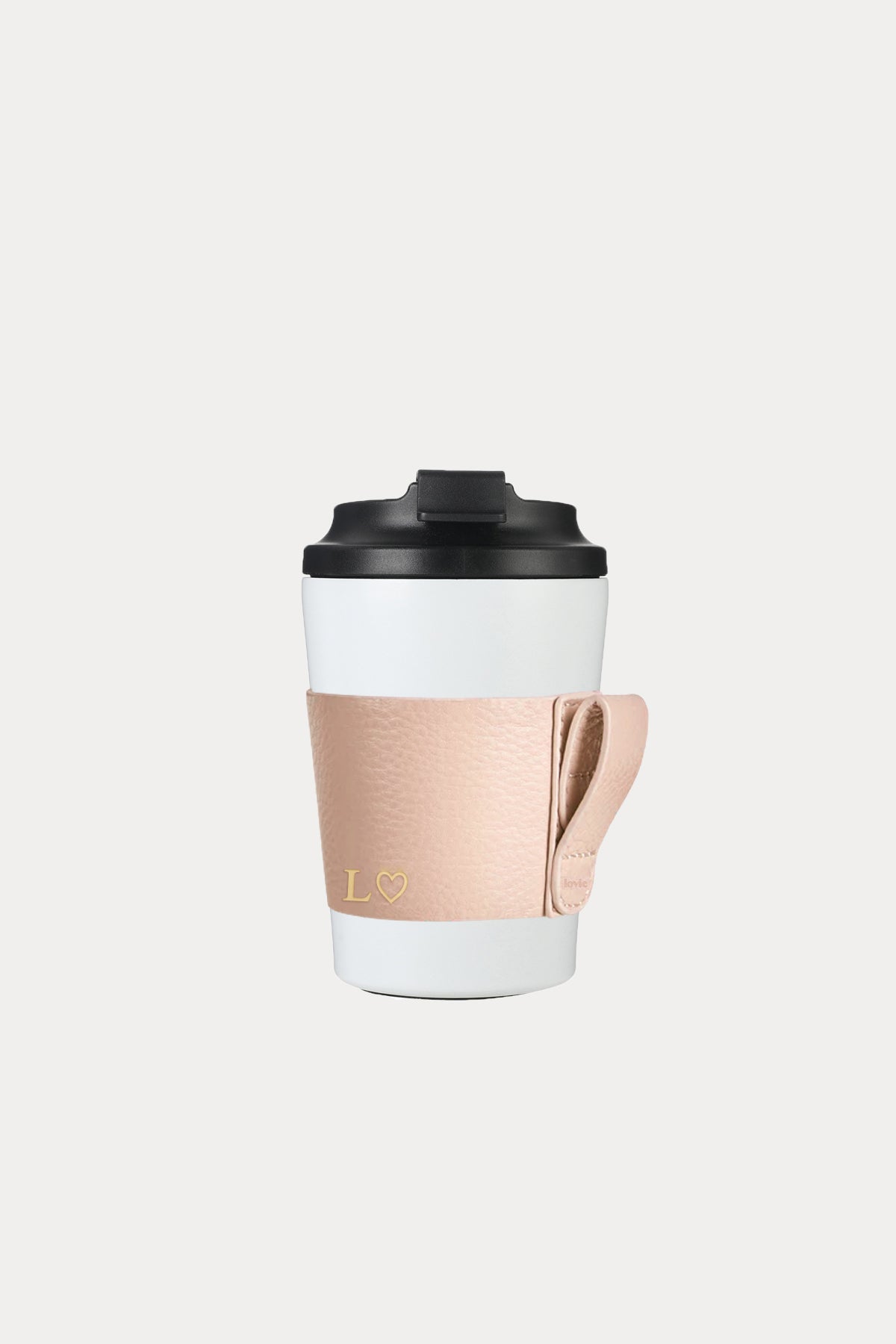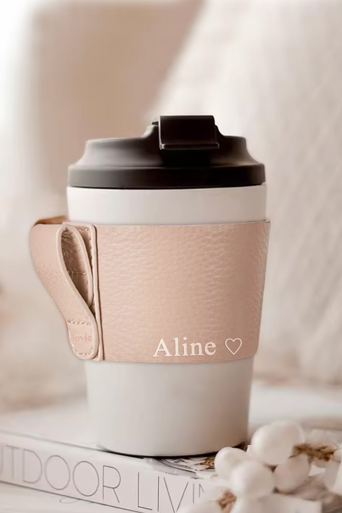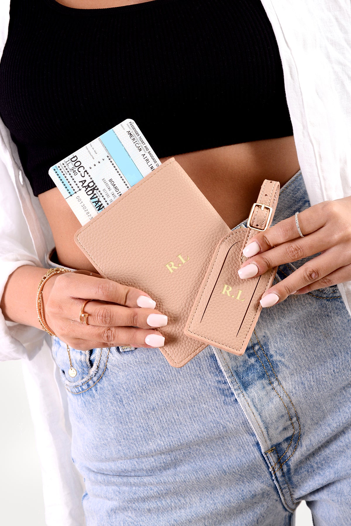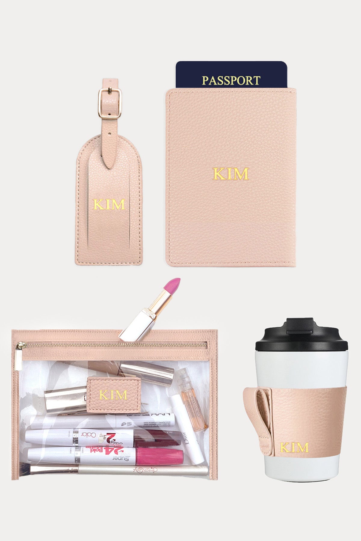 מארז עם חריטה אישית הכולל כיסוי לדרכון + תג למזוודה + כוס תרמית + תיק רחצה/איפור (מיני) מעור טבעוני בגוון בז'