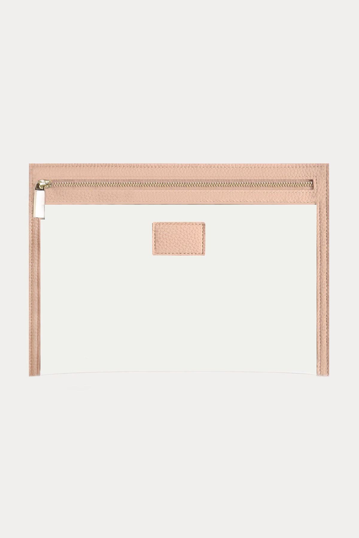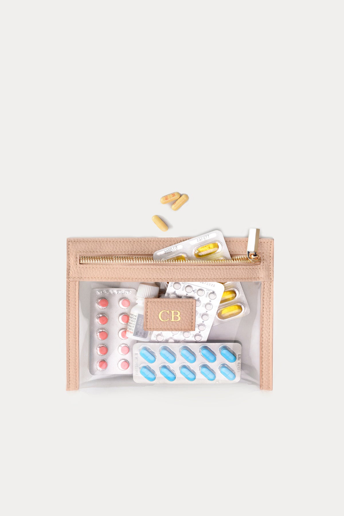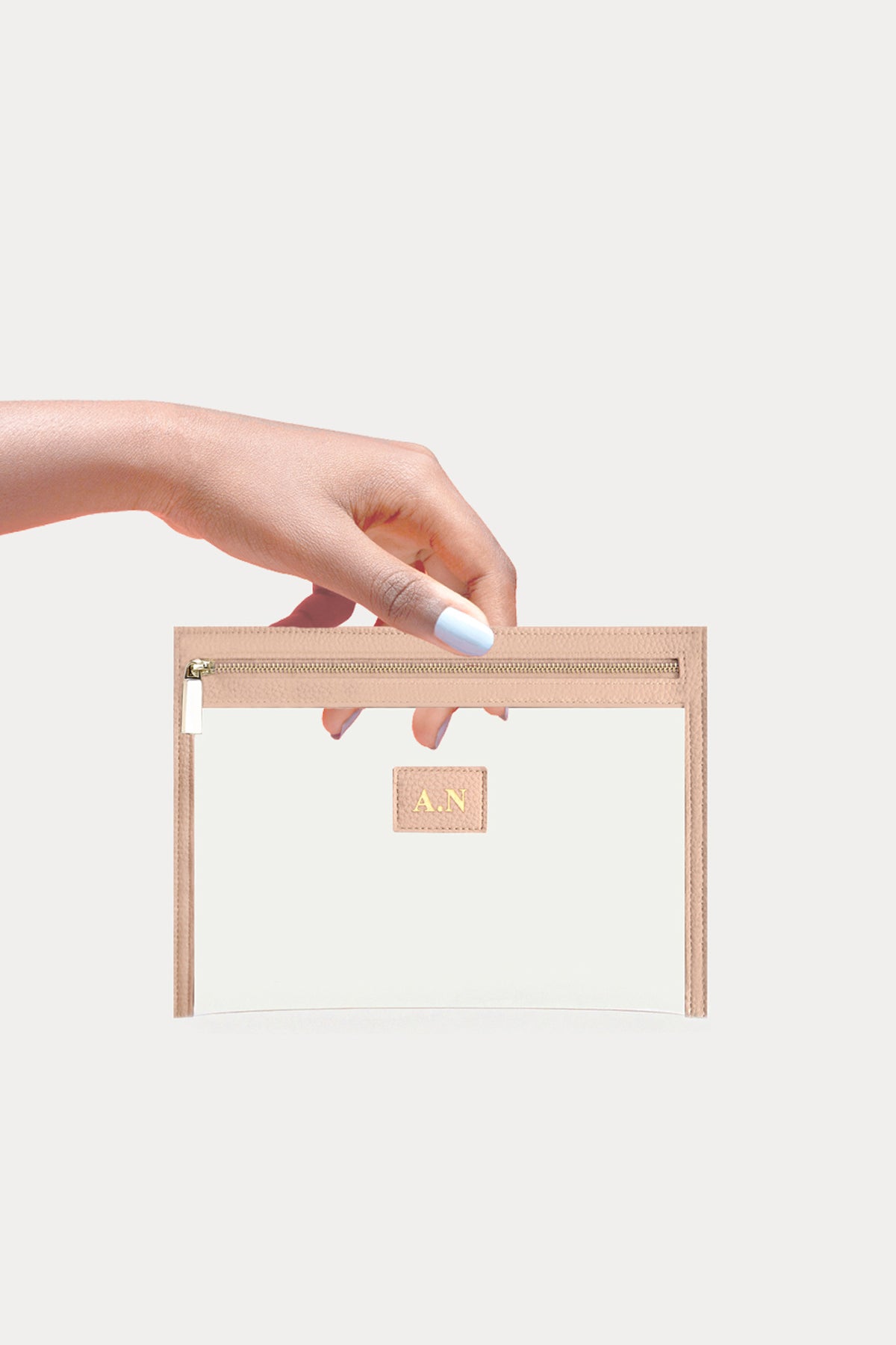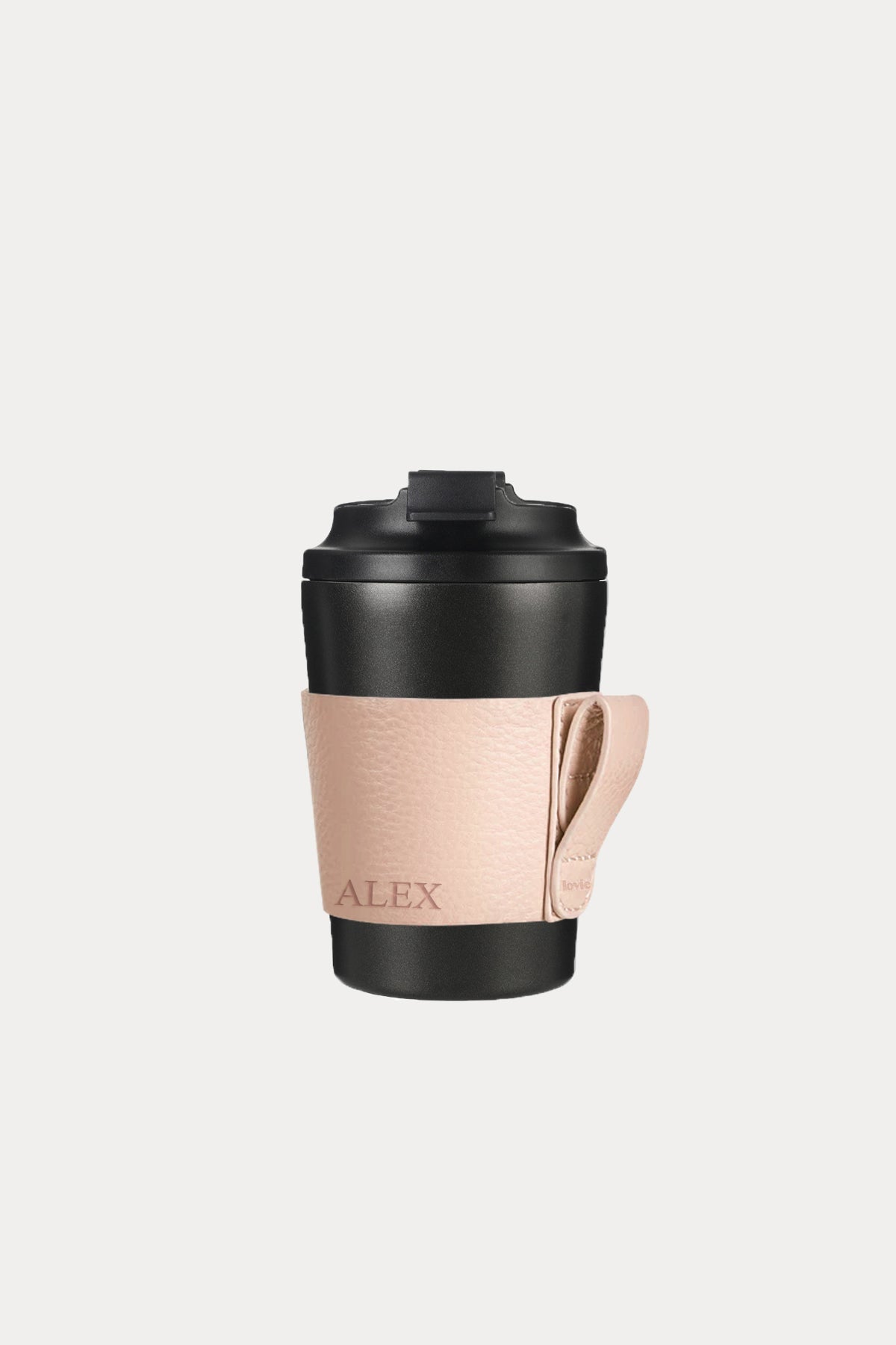 מארז עם חריטה אישית הכולל כיסוי לדרכון + תג למזוודה + כוס תרמית + תיק רחצה/איפור (מיני) מעור טבעוני בגוון בז'