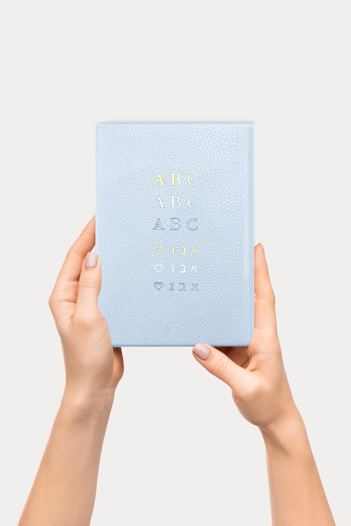 מחברת הריון ולידה עם כריכה קשה וחריטה אישית בעיצוב עור טבעוני תכלת