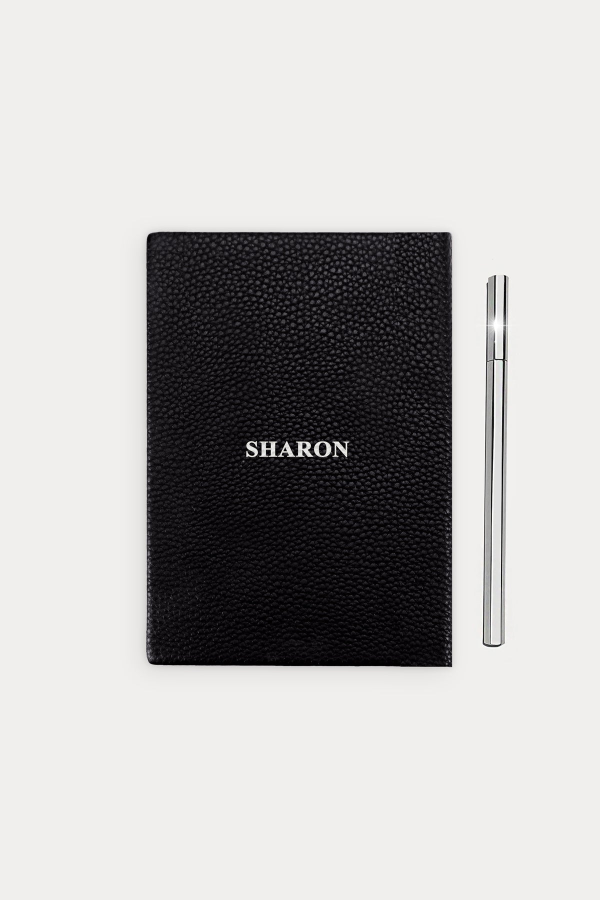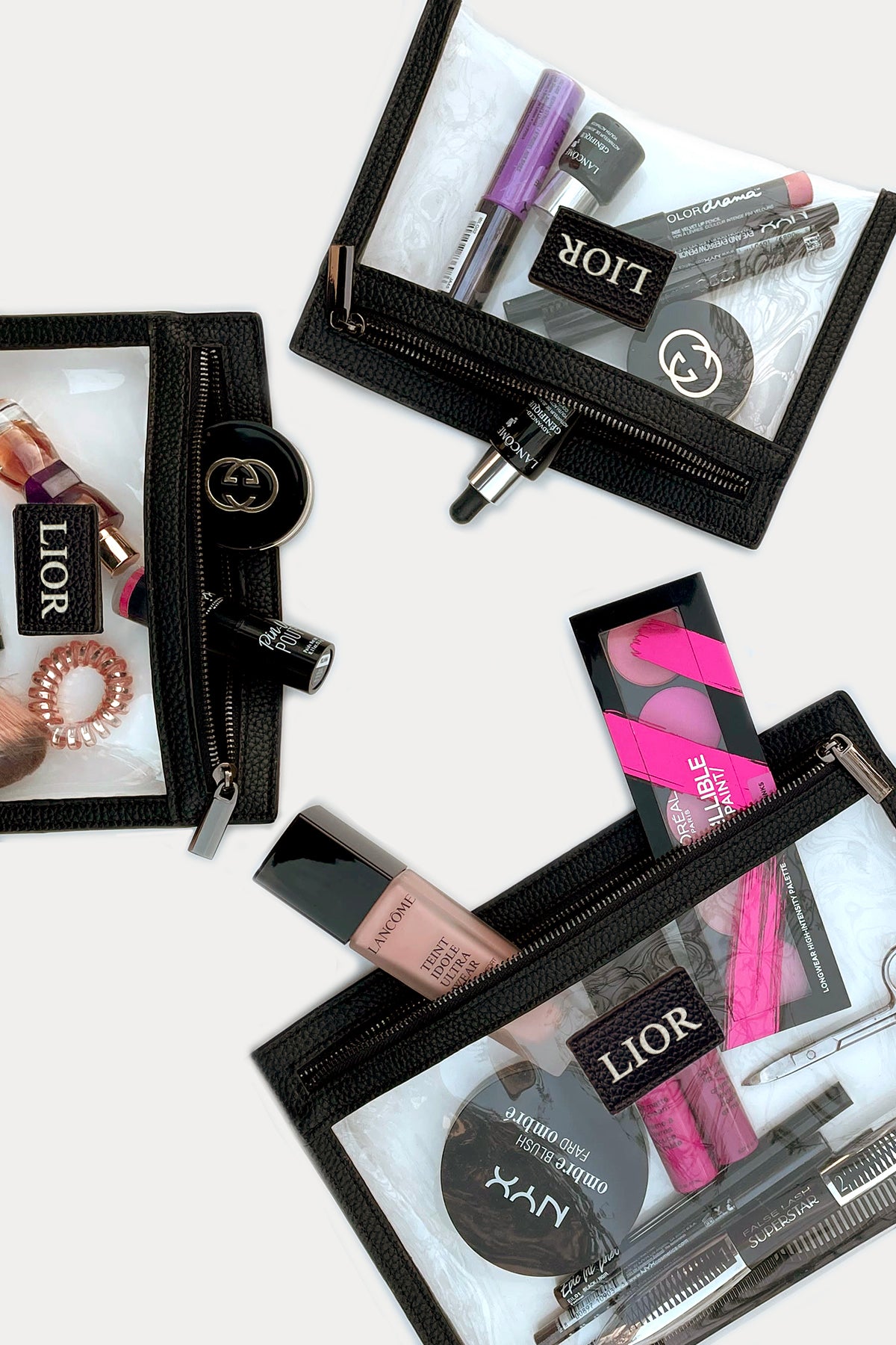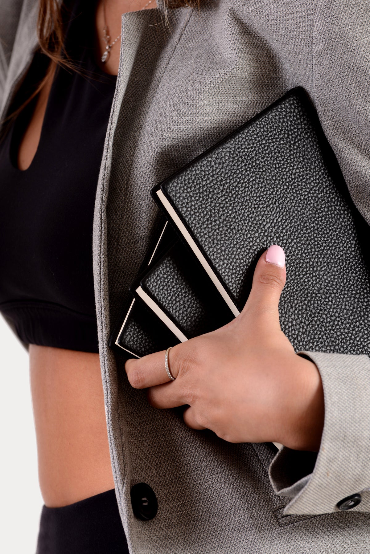 מארז הכולל מחברת שורות עם כריכה קשה + תיק איפור קטן בגוון שחור וחריטה אישית